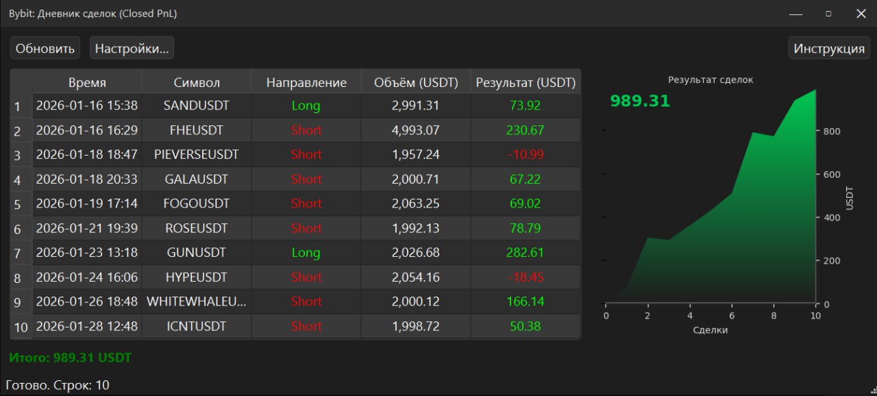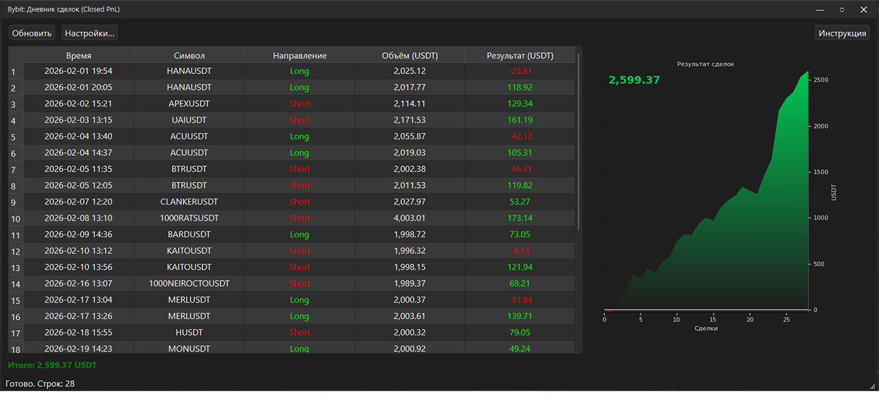 Программа подключается к аккаунту на бирже Bybit и получает всю необходимую информацию для своей работы по API протоколу биржи.